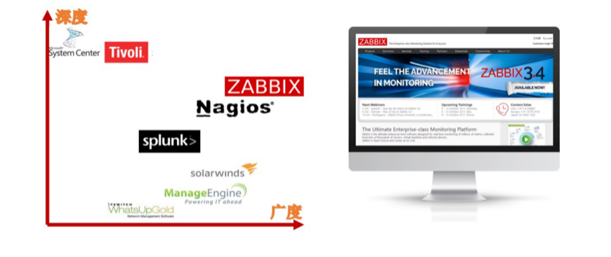 全栈级监控:就像刚才所介绍的,Zabbix 在监控的广度和深度之间做了一个比较好的权衡,它是一个全栈级的监控平台。