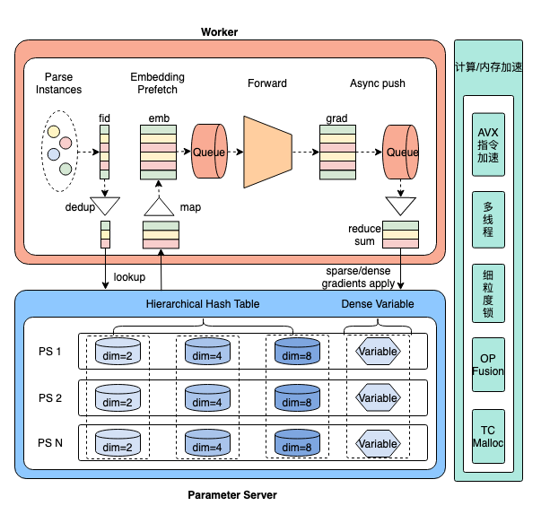 网络通讯优化:通过 embedding prefetch, gradients postpush 将网络 IO 与图的前向/后向计算异步起来,同时支持控制流与数据流分离、压缩传输等优化; -