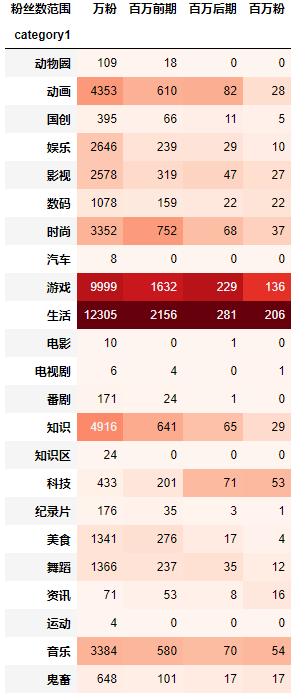 根据颜色可以看到依然是生活和游戏类别的up主的最多,动画和知识的up主也不少,说明B站也有很多爱学习的好童鞋。