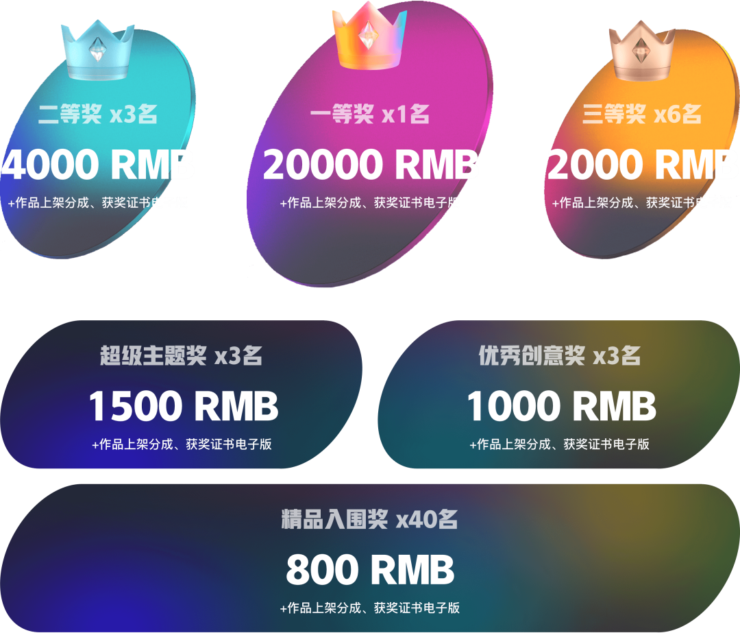 以上所有奖金及上架分成均为税前金额,其中,获奖参赛者需同意本次大赛相关版权条款,才能领取对应奖金。