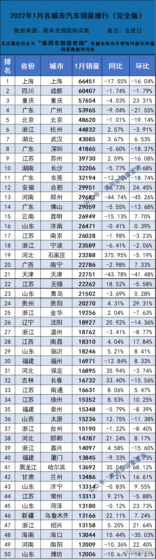 2022年1月汽车终端零售销量全国城市排行出炉:上海位居第一,成都位居第二、重庆第三,广州第四、北京第五、杭州第六、武汉第七、深圳第八、苏州第九、长沙第十。