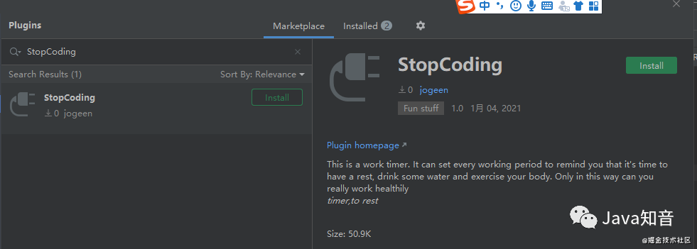 1.在idea中直接搜索安装StopCoding插件(官方已经审核通过)