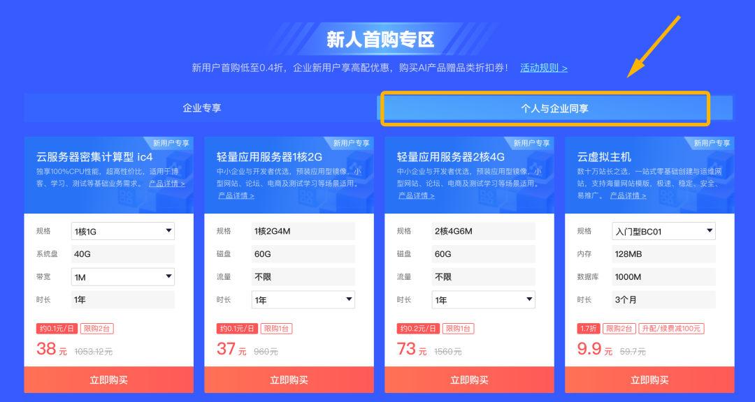 比较了一圈下来,本文决定采用百度云服务器。原因无它,一方面因为因为是新用户,另外一方面它正好有开年的活动,价格探底。