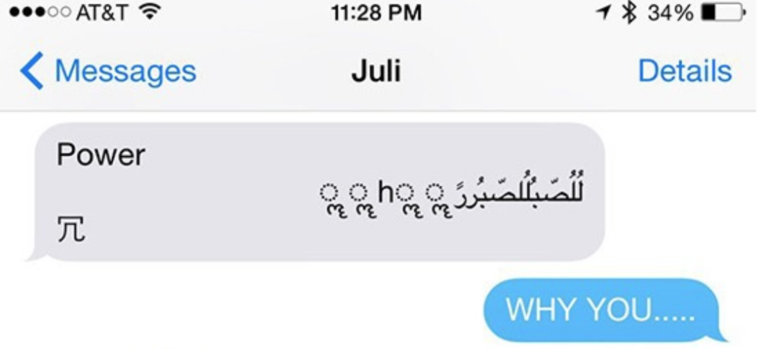 到了 iOS 8 时代,iPhone 又出现了一个让人感到匪夷所思的 BUG,那就是尤为经典阿拉伯字符串炸机事件。当时只要有 iPhone 用户受到了这么一串莫名其妙的阿拉伯文字符,而且点击文本就会让大几千买的 iPhone 变成“残疾”:轻则短信闪退,重则死机变砖,只能去苹果官方售后去解决问题。
