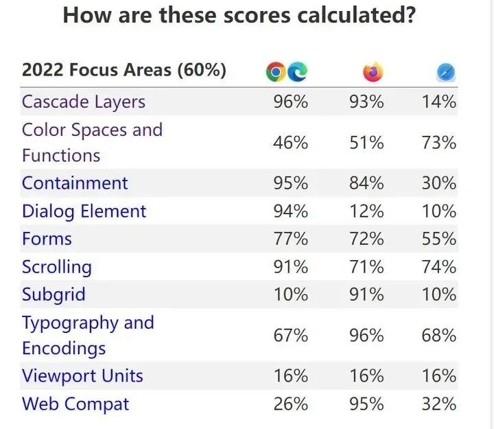 Interop 2022 在 Compat 2021 的基础上加入了 10 个互操作性项目,根据浏览器的表现从 0-100 为其打分。