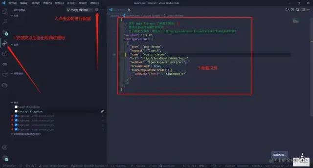 安装完以后,左边会出现一个调试的小图标,打开以后再点击上方小齿轮进行配置。根目录下会自动新建 .vscode 文件夹以及 launch.json 文件,不用管。