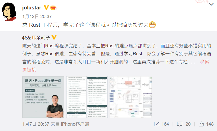 承担着「Rust 第一课」的使命,陈天讲得通俗易懂,把各个知识点类比到不同的语言中,设计了很多小而美的示例代码,引入 Rust 标准库的源代码进行分析,并且还精心绘制了大量的原理图。