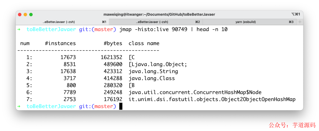 我们使用 jmap -histo:live pid | head -n 10 命令就可以查看到堆内对象示例的统计信息、查看 ClassLoader 的信息以及 finalizer 队列。
