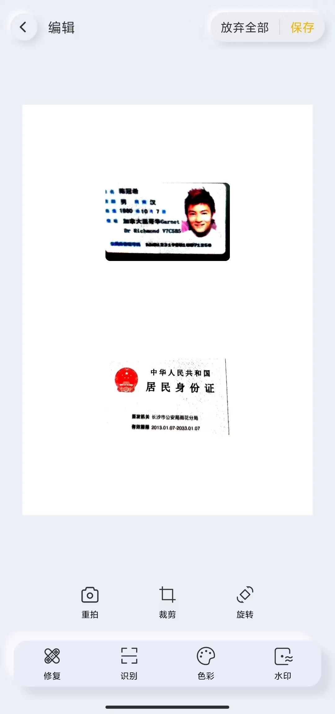 证件扫描功能里,可以扫描卡证、卡证(双拼)、户口本、户口本(双拼),护照、驾驶照和行驶证。特别这里的双拼的功能,我觉得太实用了,我之前为了扫描身份证,扫出来正反面后,还要用PS把它合成一张,很麻烦。用这款就能很容易实现正反面双拼。
