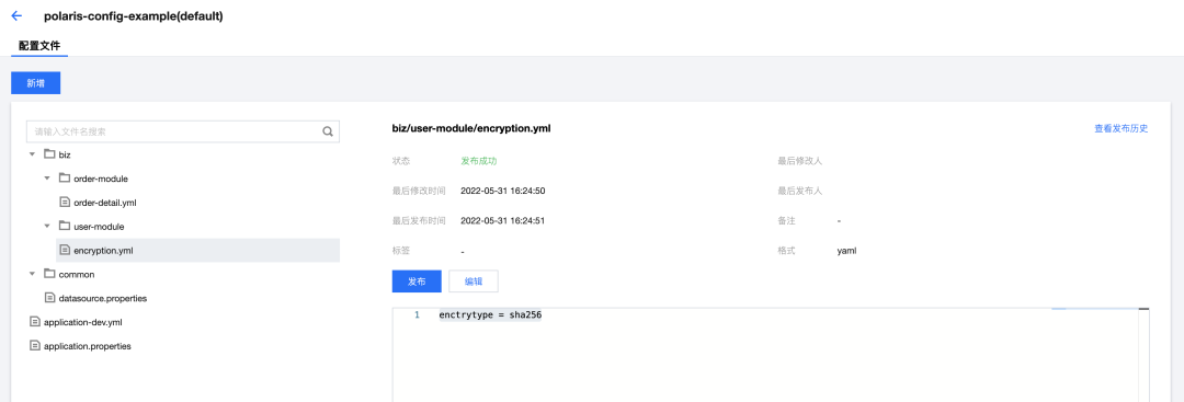 配置中心核心能力是配置管理能力以及动态实时推送能力。在配置管理方面,一个应用往往具有非常多的配置文件,如何清晰的管理配置文件是一个非常重要的能力。我们在管控台设计 UI 时,开创性的把文件名以 / 作为分隔符树状形式展示。如下图所示,可以按应用模块划分目录,通过目录方式能够清晰管理一个应用下杂乱的配置文件。