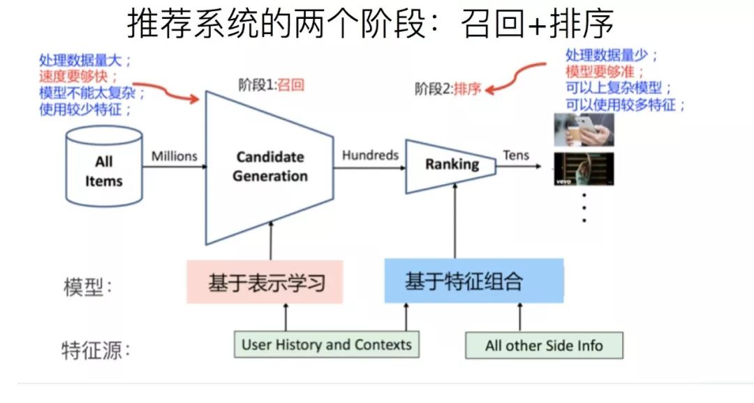 实际的工业推荐系统,如果粗分的化,经常讲的有两个阶段。首先是召回,主要根据用户部分特征,从海量的物品库里,快速找回一小部分用户潜在感兴趣的物品,然后交给排序环节,排序环节可以融入较多特征,使用复杂模型,来精准地做个性化推荐。召回强调快,排序强调准。当然,这是传统角度看推荐这个事情。