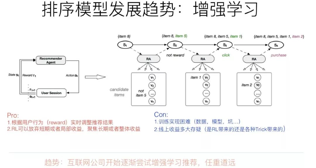 3. 有利于推荐系统长期收益建模。这点是增强学习做推荐最有优势的一个点。我们优化推荐系统,往往会有一些短期的目标比如增加点击率等,但是长期目标比如用户体验或者用户活跃留存等指标,一般不太好直接优化,而增强学习模型比较容易对长期收益目标来进行建模。