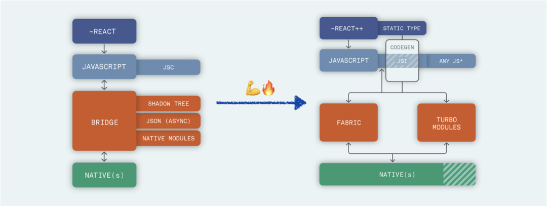 JSI(JavaScript interface):这是本次架构重构的核心重点,也正是因为这层的调整,将原有重度依赖的 native bridge 架构解耦,实现了自由通讯。