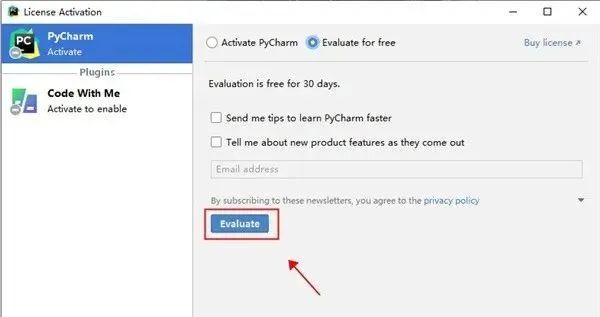 5、启动软件,弹出注册界面,选择evaluate for free,点击evaluate试用软件