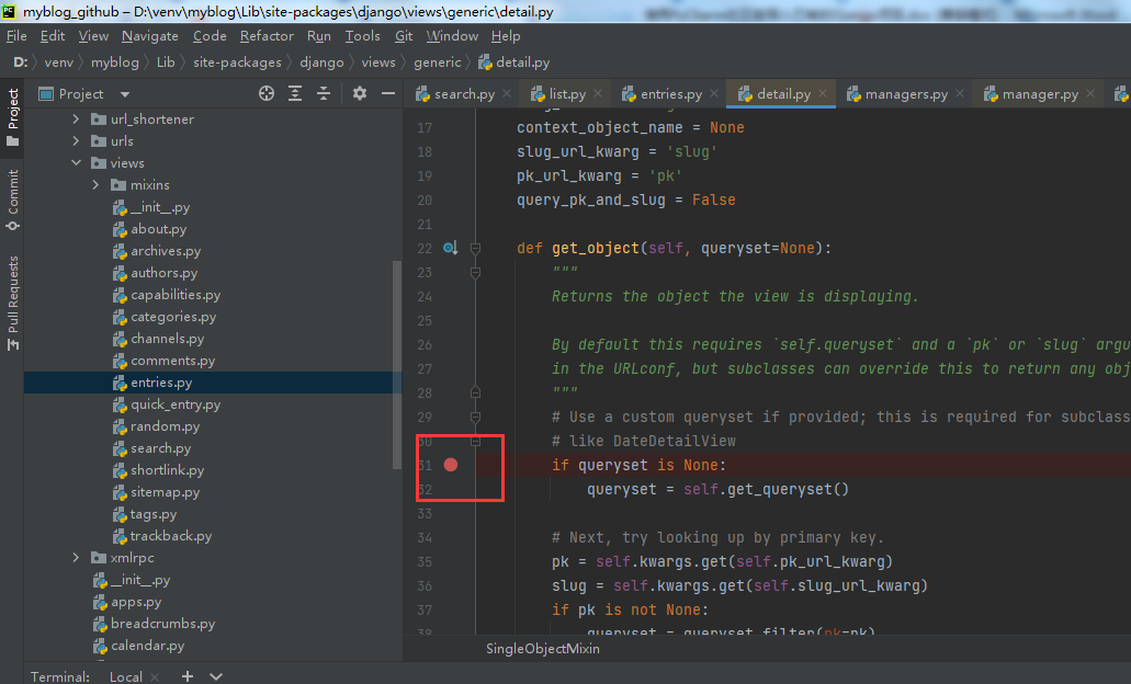 通过PyCharm左侧Project栏中打开一个view文件,在下图位置单击鼠标,出现断点标志,说明已经设置好断点。