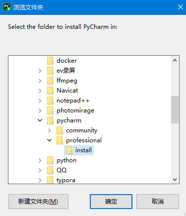 (建议大家像我这样,选择一个盘,专门创建一个文件夹来安装各类软件。需要特别注意,安装路径最好不要使用中文,例如我的路径为:D:\soft\pycharm\professional\install。这里大家需要记住自己的安装路径,后面会用到。)