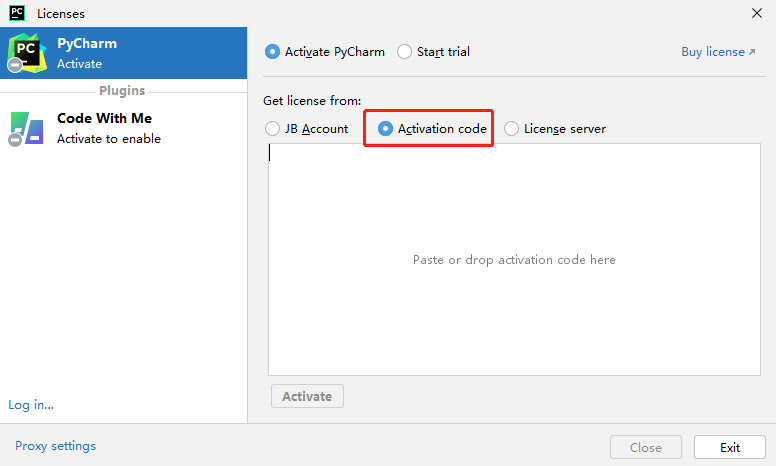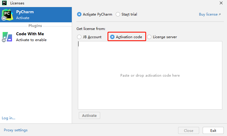 第五步:再次双击桌面pycharm快捷方式,重新打开pycharm。弹出"Licenses"界面后,再次点击选中"Activation code",出现激活码输入框。