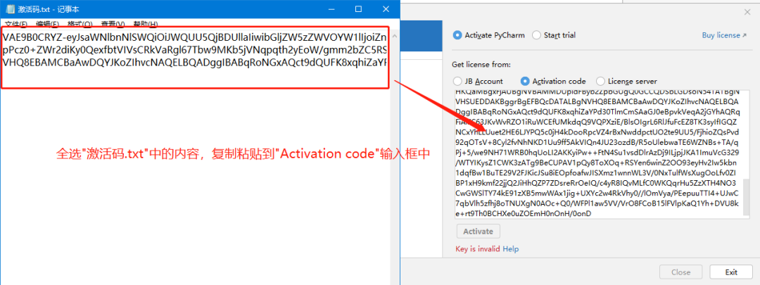 再次打开"jetbra"目录下的"激活码.txt",全选"激活码.txt"中的内容,并复制粘贴到"Activation code"输入框中。
