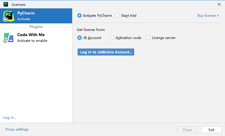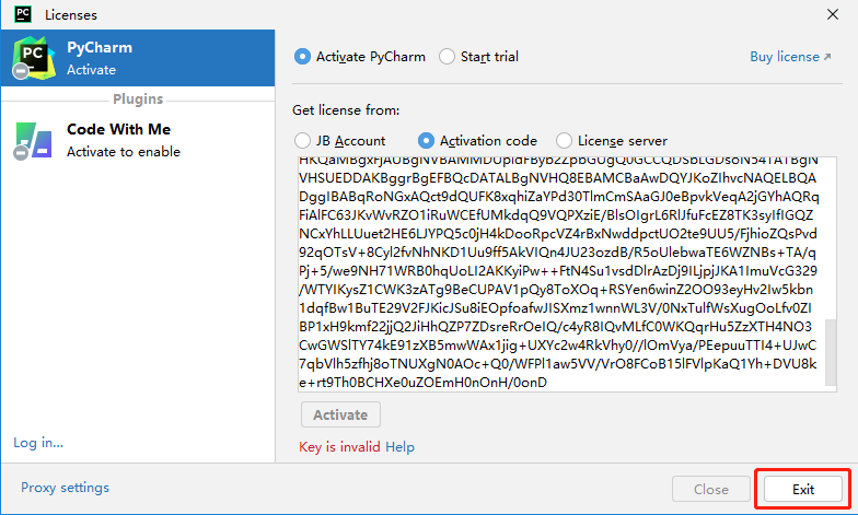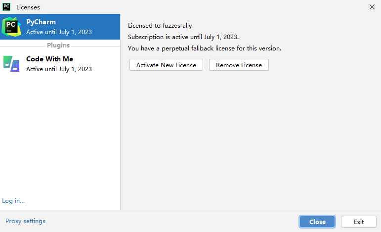 第四步:点击"Licenses"界面中的"Exit",退出pycharm。