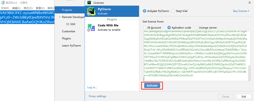 全选"激活码.txt"中的内容,并复制粘贴到"Activation code"输入框中。