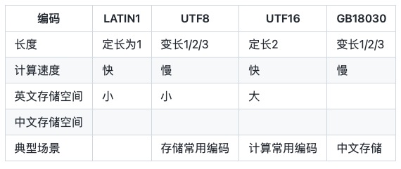 1常见字符串编码●常见的字符串编码有:LATIN1 只能保存ASCII字符,又称ISO-8859-1。UTF-8 变长字节编码,一个字符需要使用1个、2个或者3个byte表示。由于中文通常需要3个字节表示,中文场景UTF-8编码通常需要更多的 …
